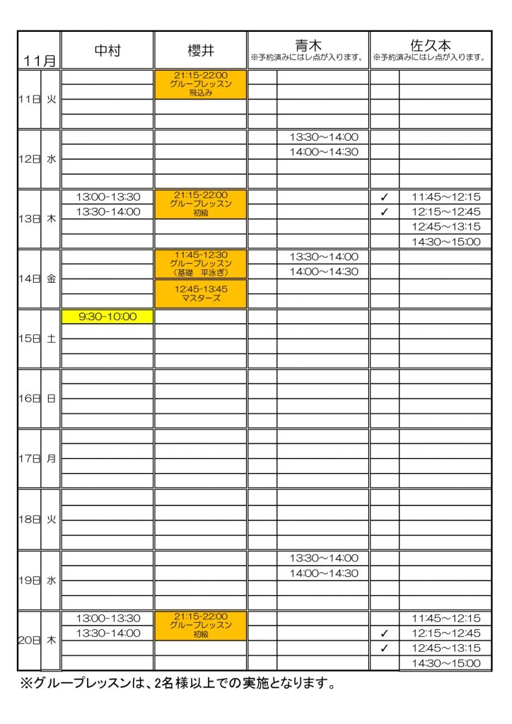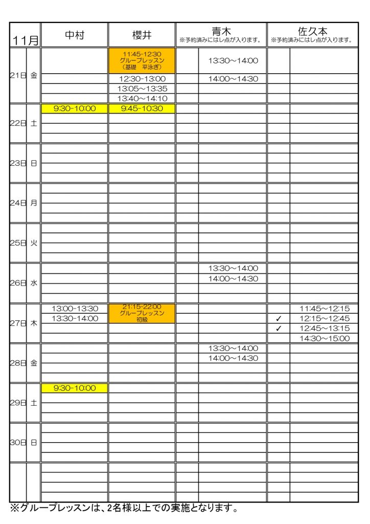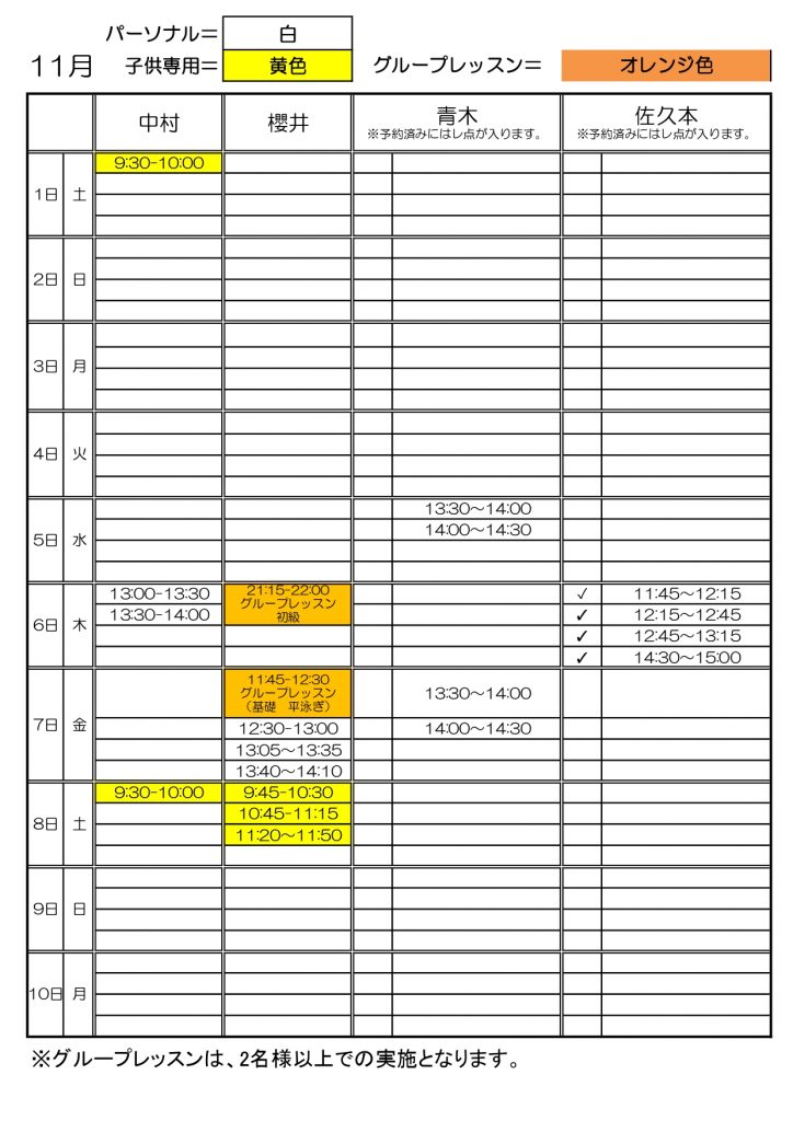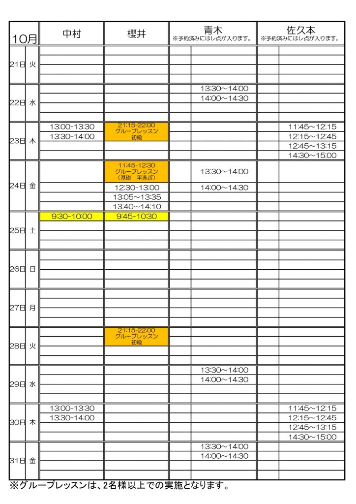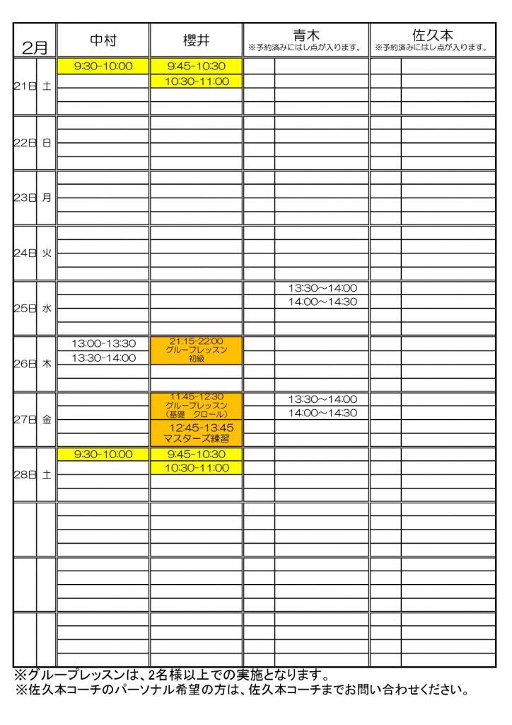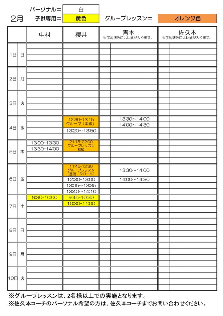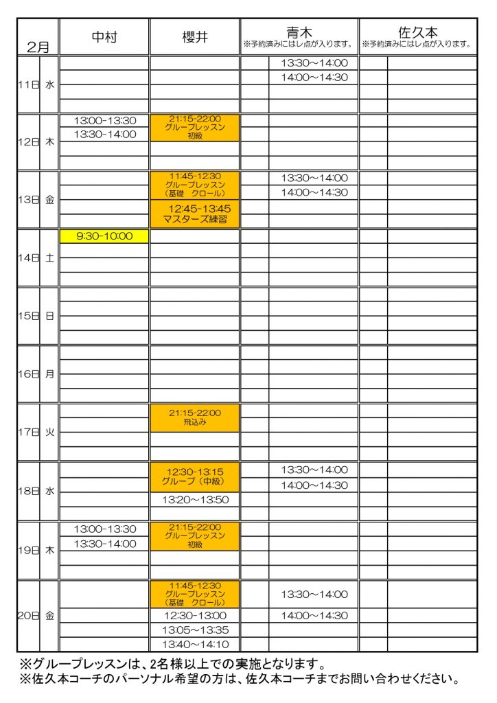スイミングパーソナル予定表